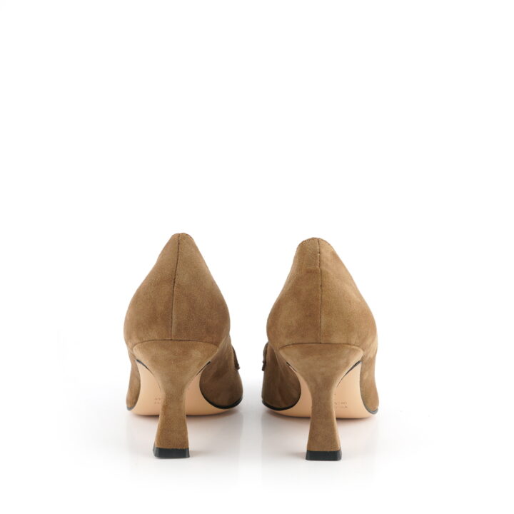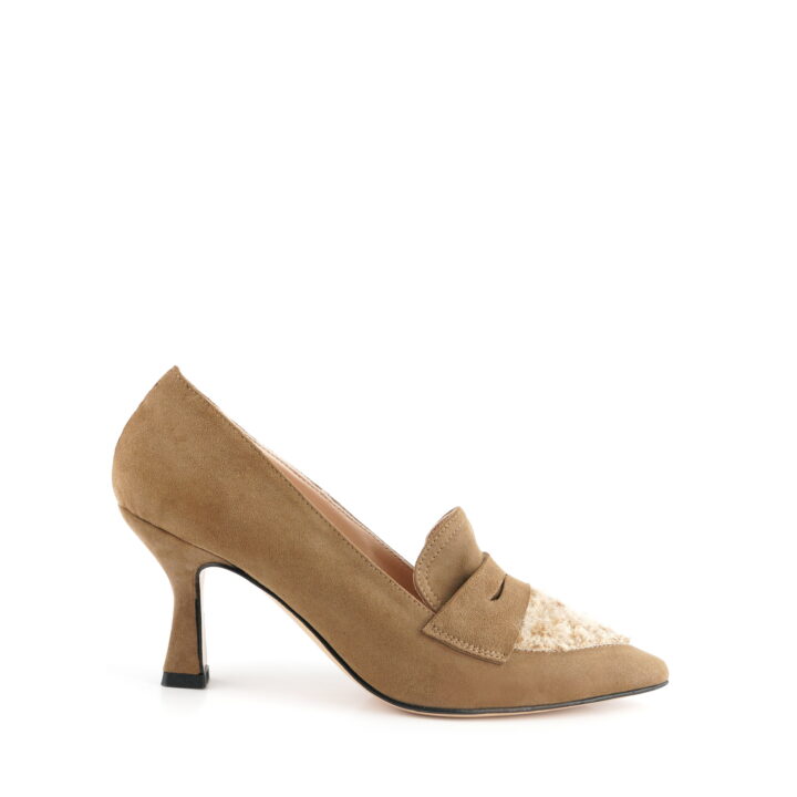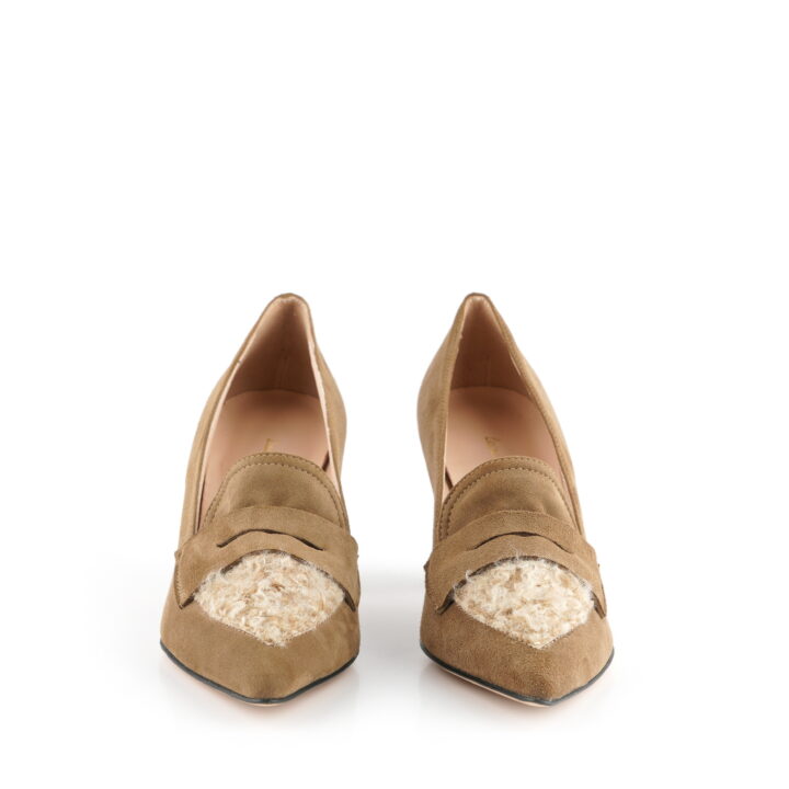 Décolleté in camoscio taupe e lana.