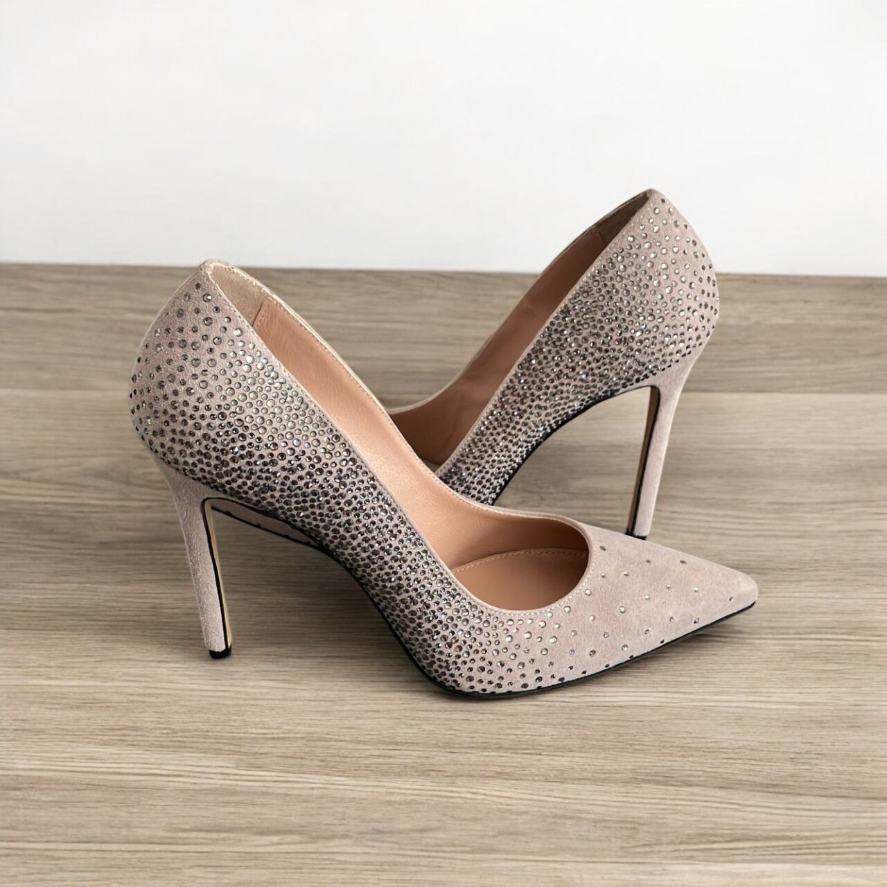 Decolletè camoscio talpa e strass. Tacco 10 cm. Taupe suede decolletè with rhinestones. 10 cm heel.
