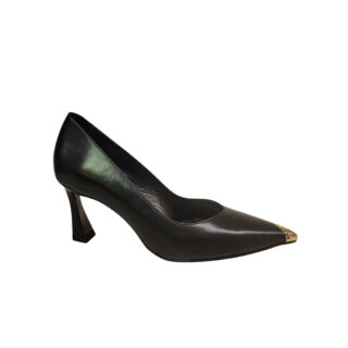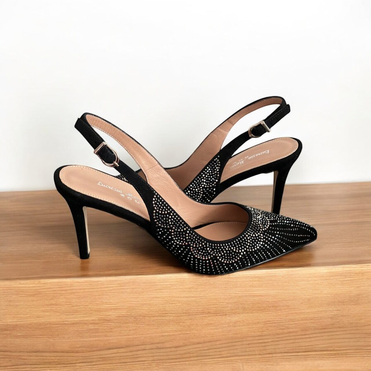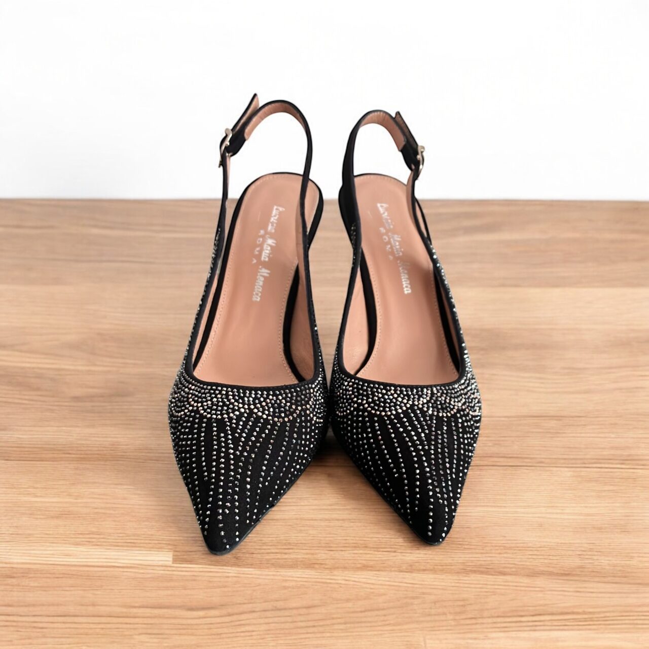 Slingback camoscio nero e strass. Tacco 7 cm. Black suede slingback with rhinestones. 7 cm heel.