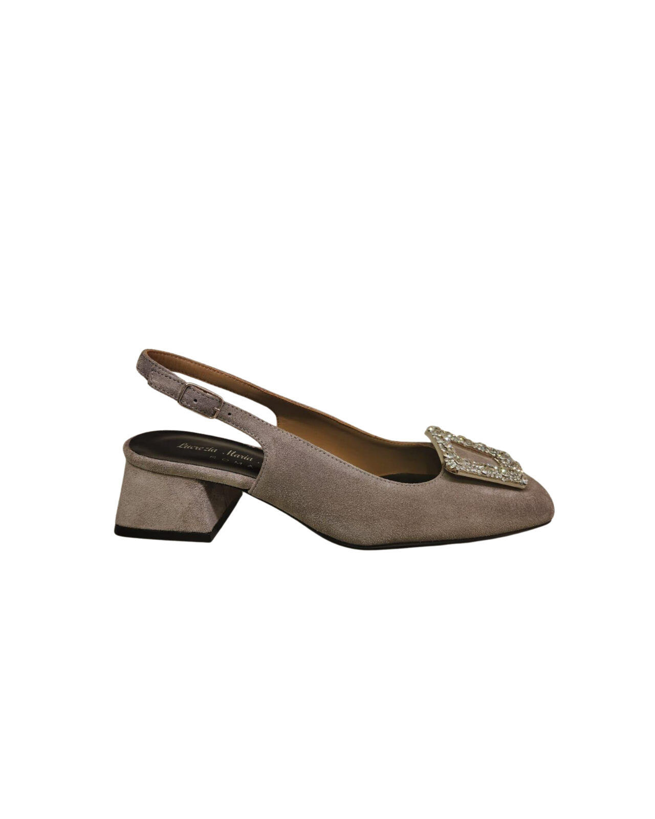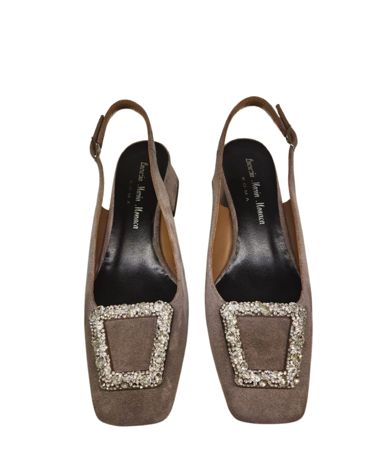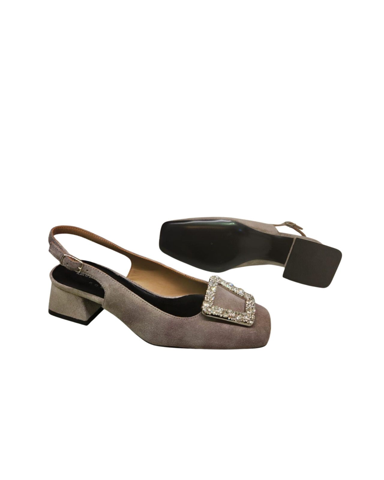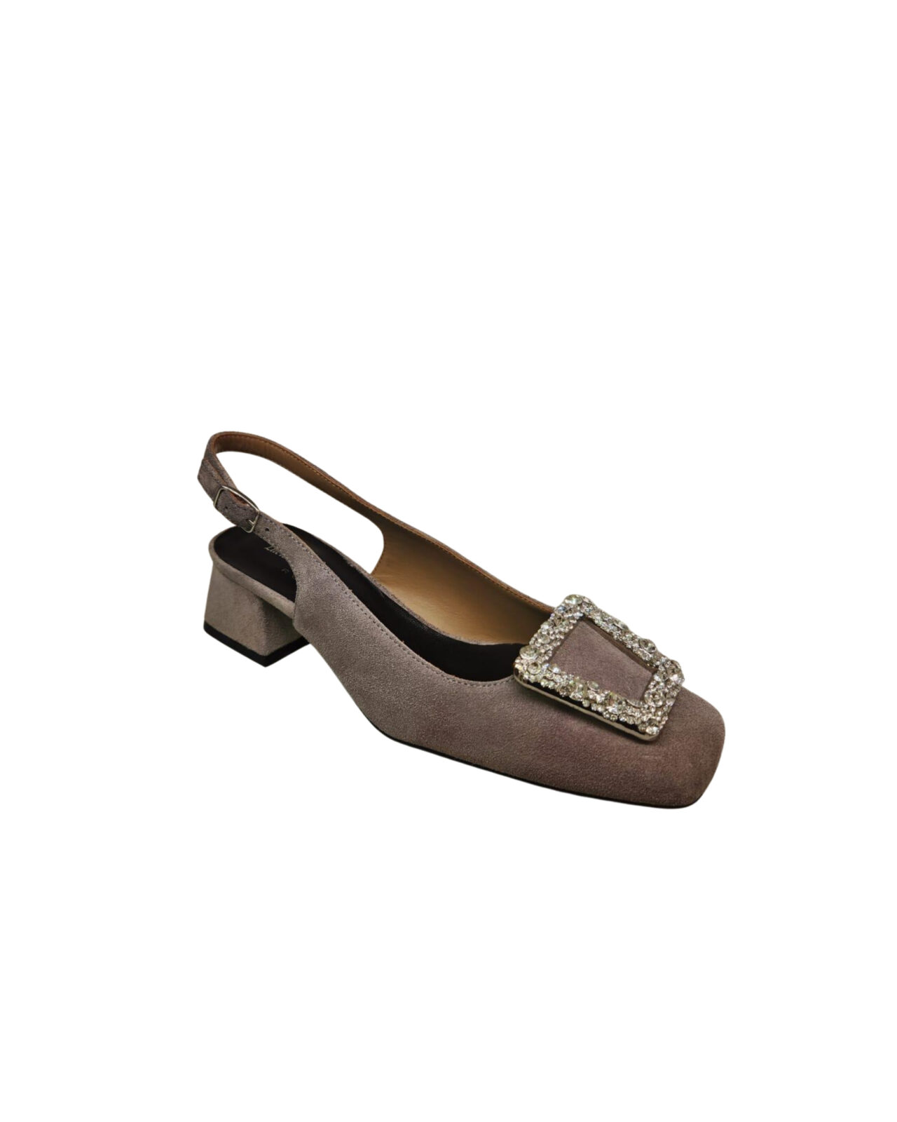 Camoscio talpa slingback con fibbia strass. tacco 4 cm Taupe suede slingback with rhinestones buckle. 4 cm heel