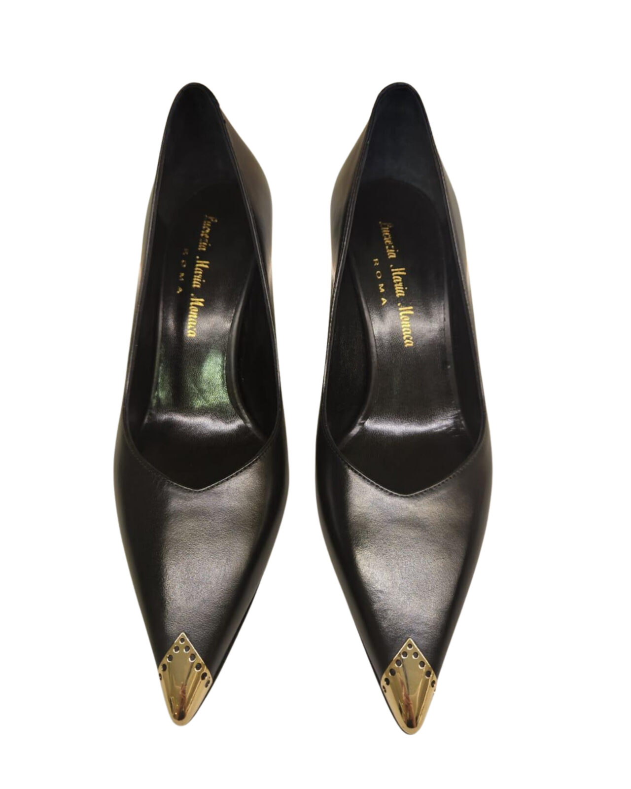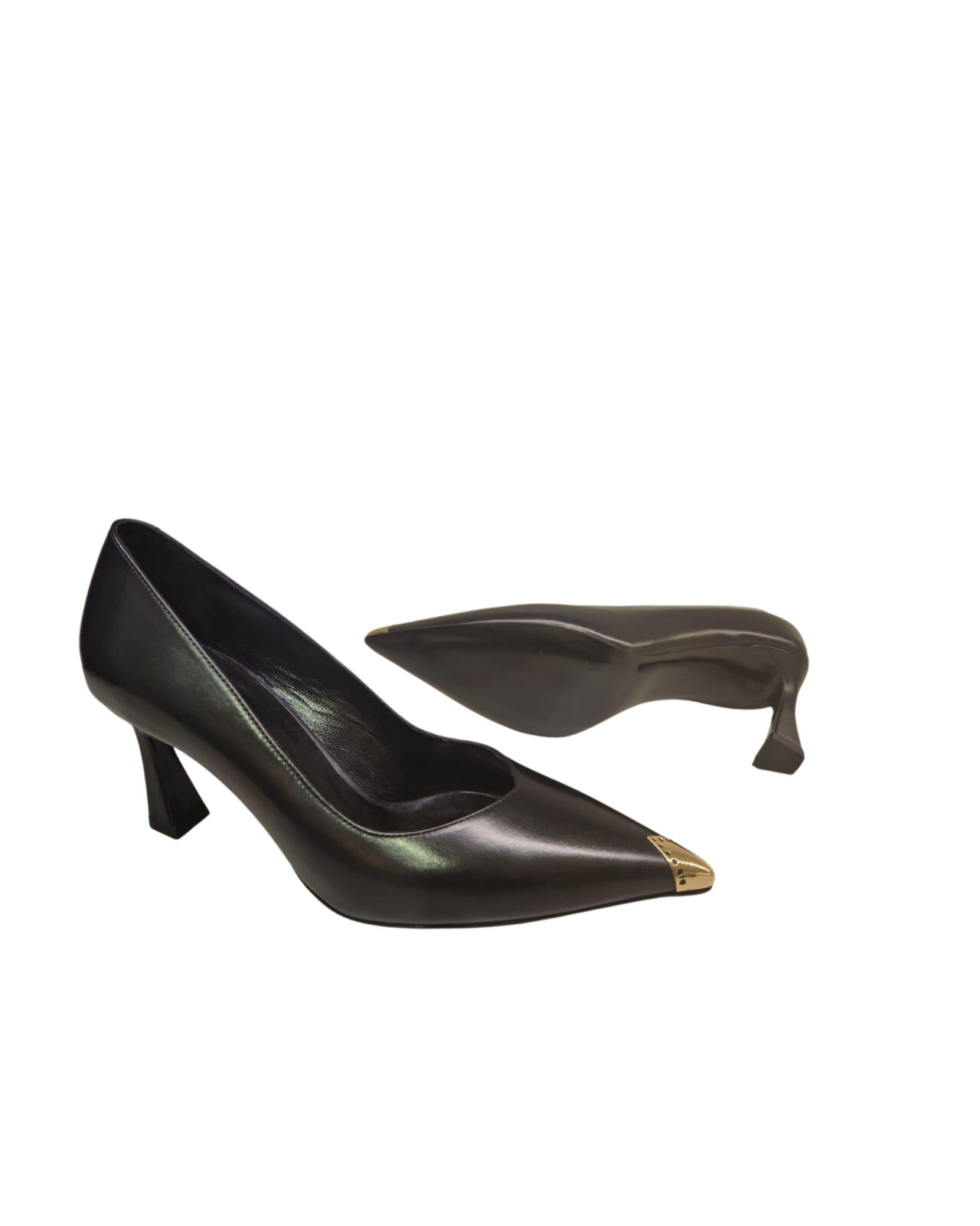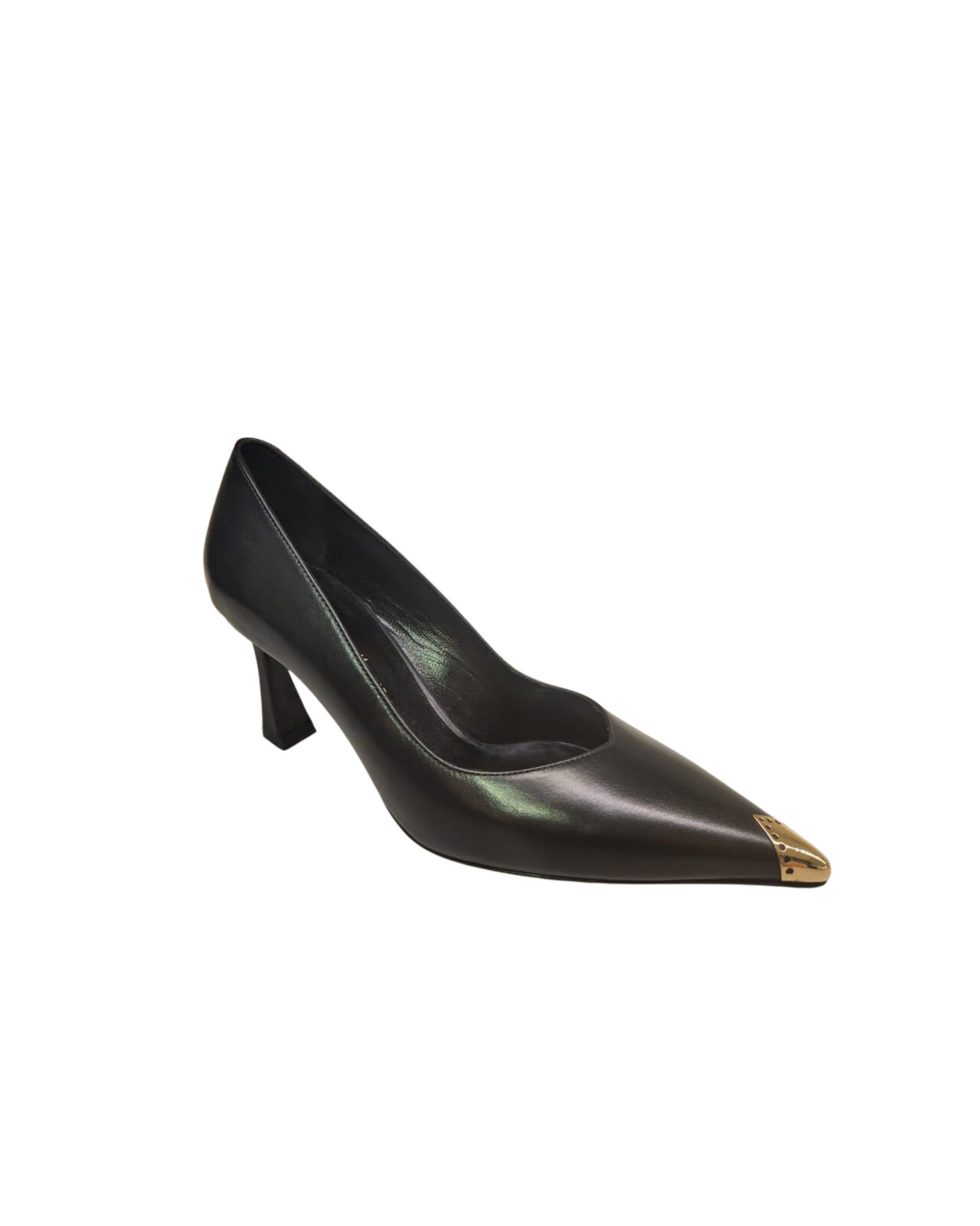 Pelle nera decolletè punta oro. tacco 7,5 cm Black leather gold tip decolletè. 7,5 cm heel