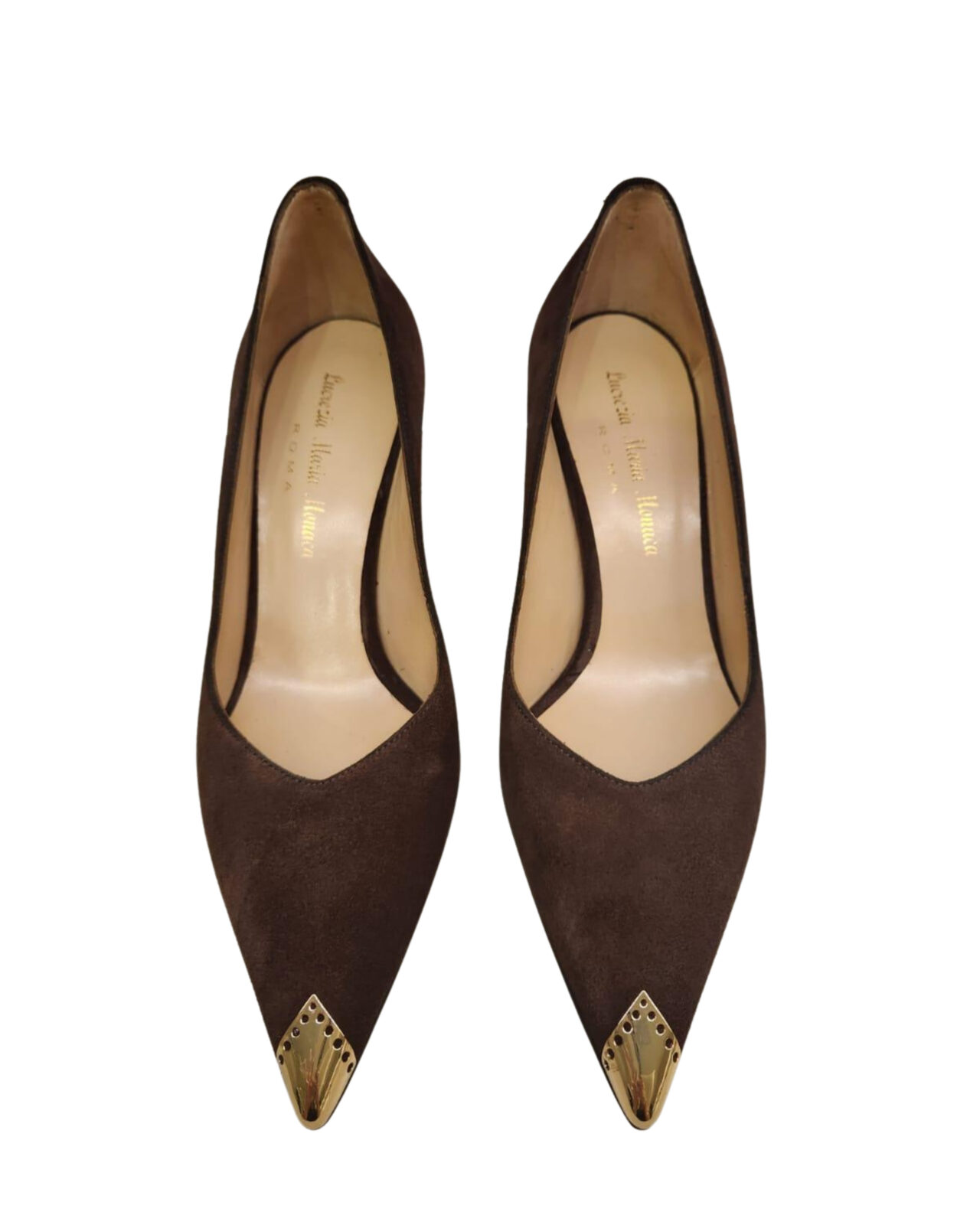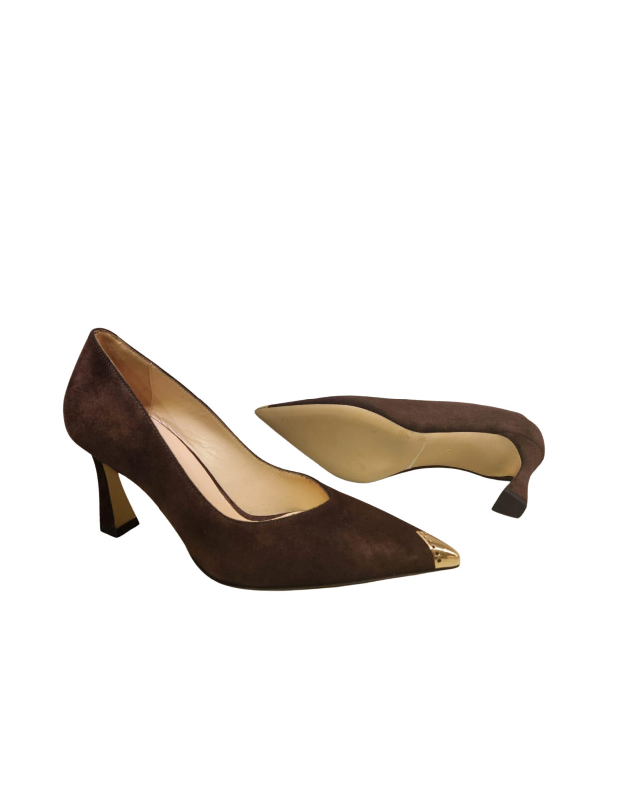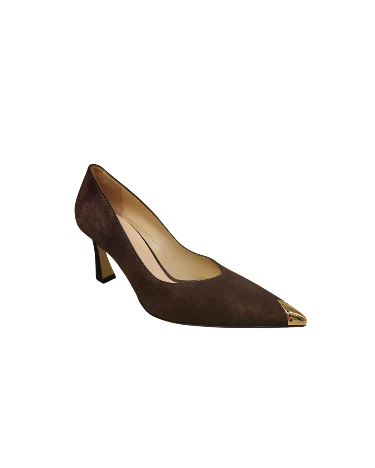 Camoscio marrone decolletè punta oro. tacco 7,5 cm Brown suede gold tip decolletè. 7,5 cm heel