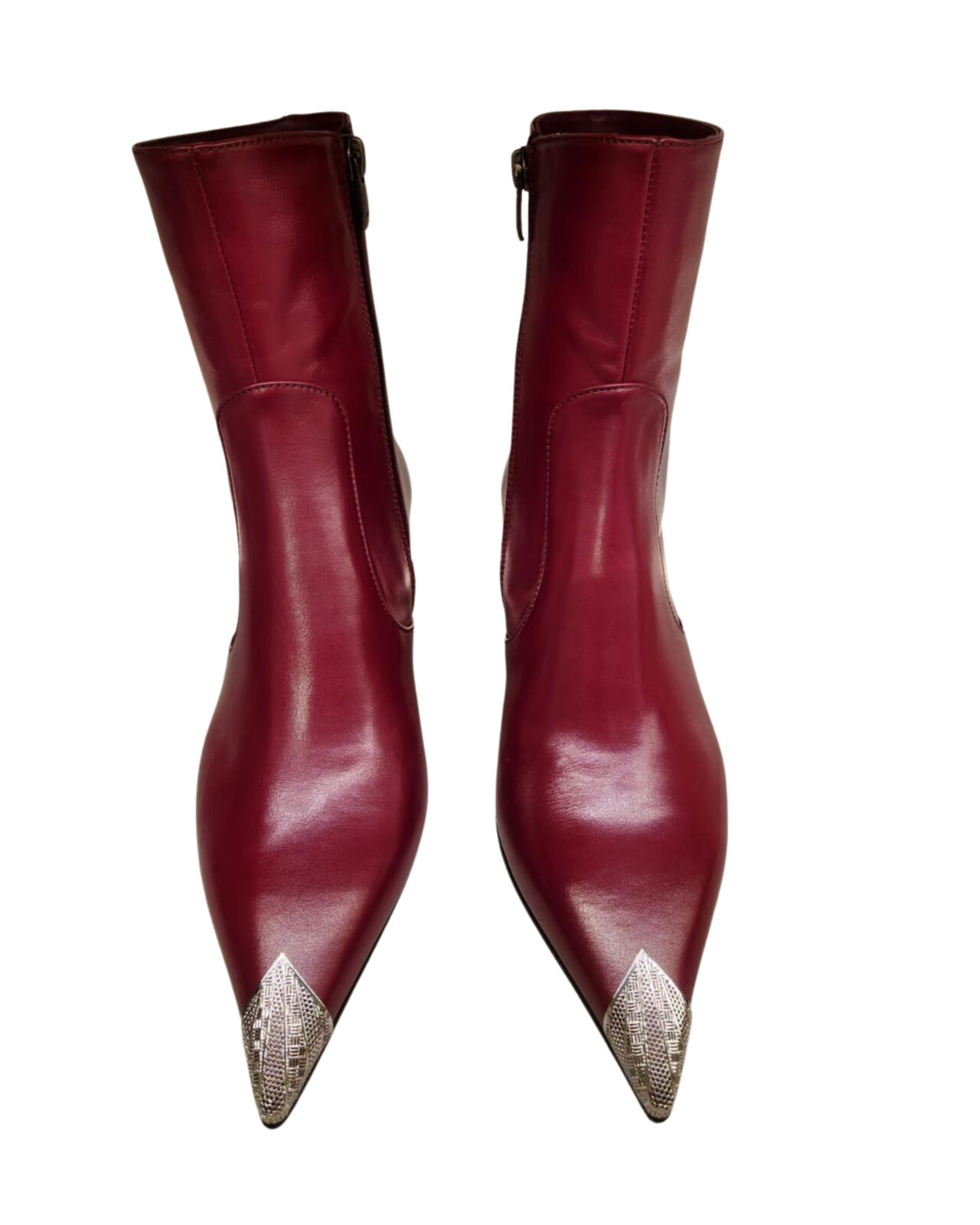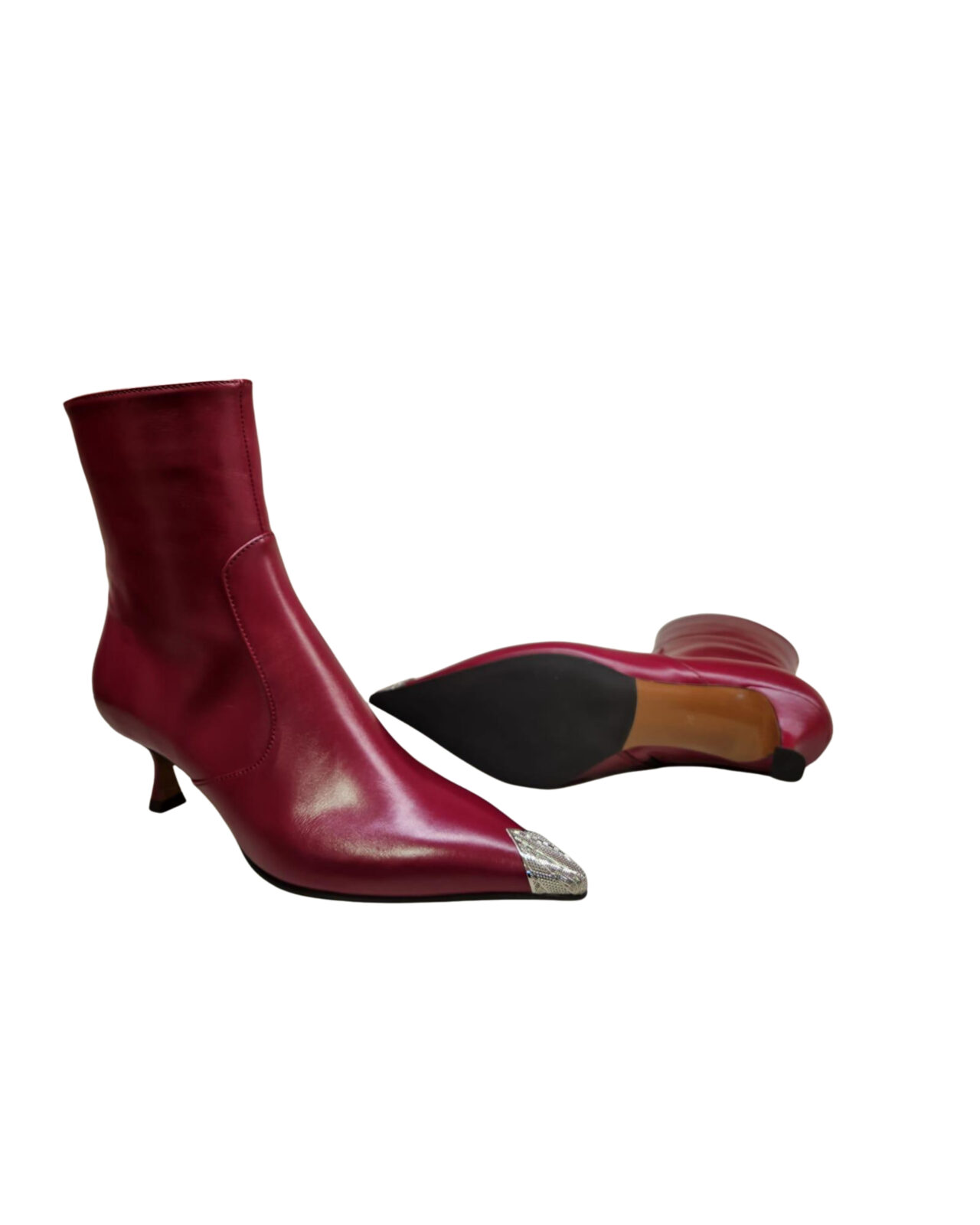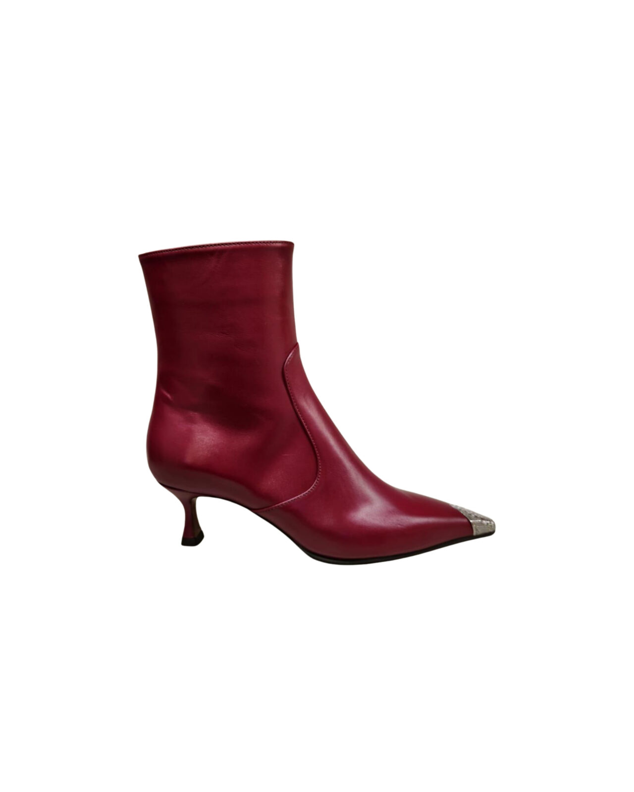 Pelle bordeaux tronchetto con punta argento e zyp. tacco 5,5 cm Burgundy leather silver tip mid calf boots. 5,5 cm heel