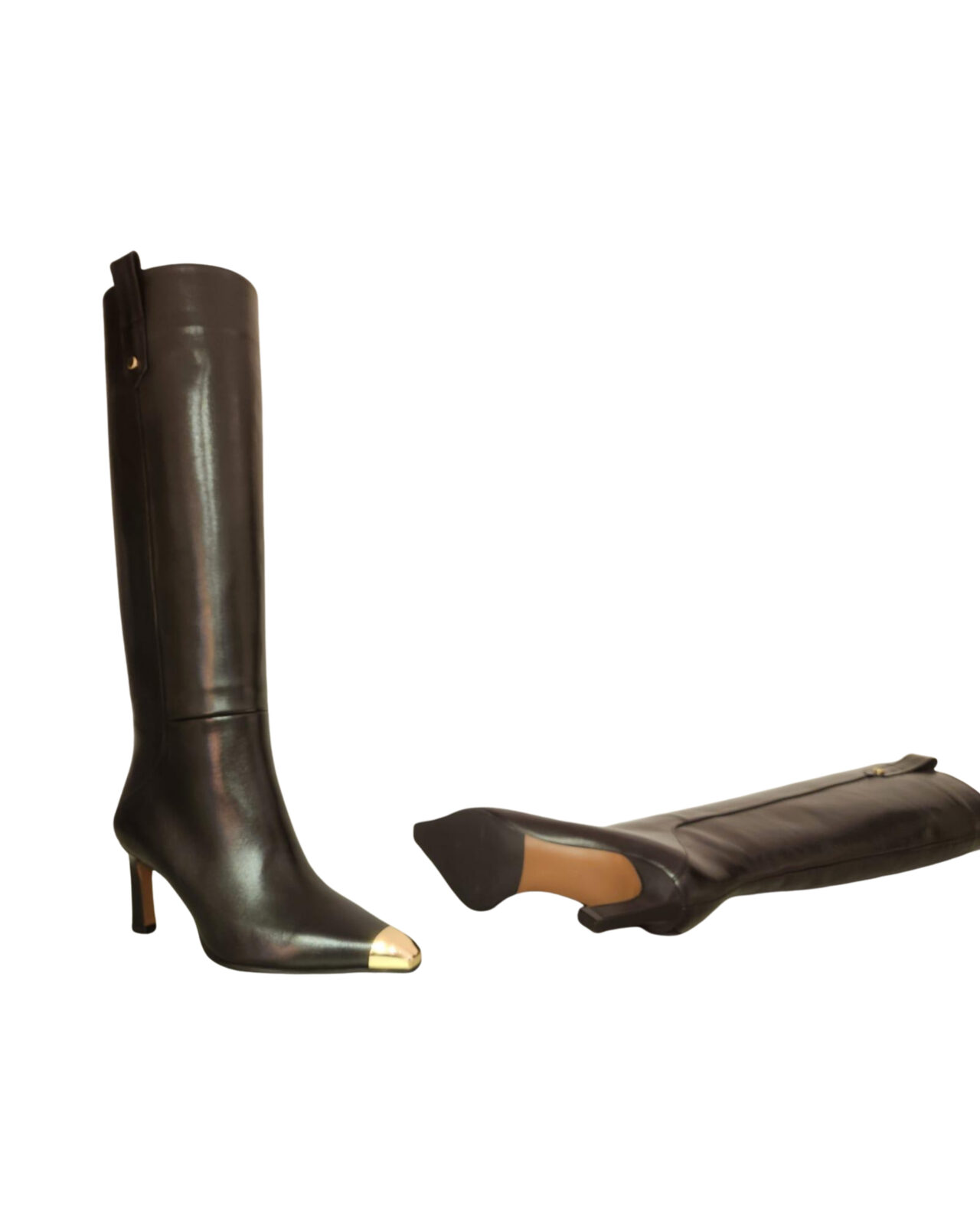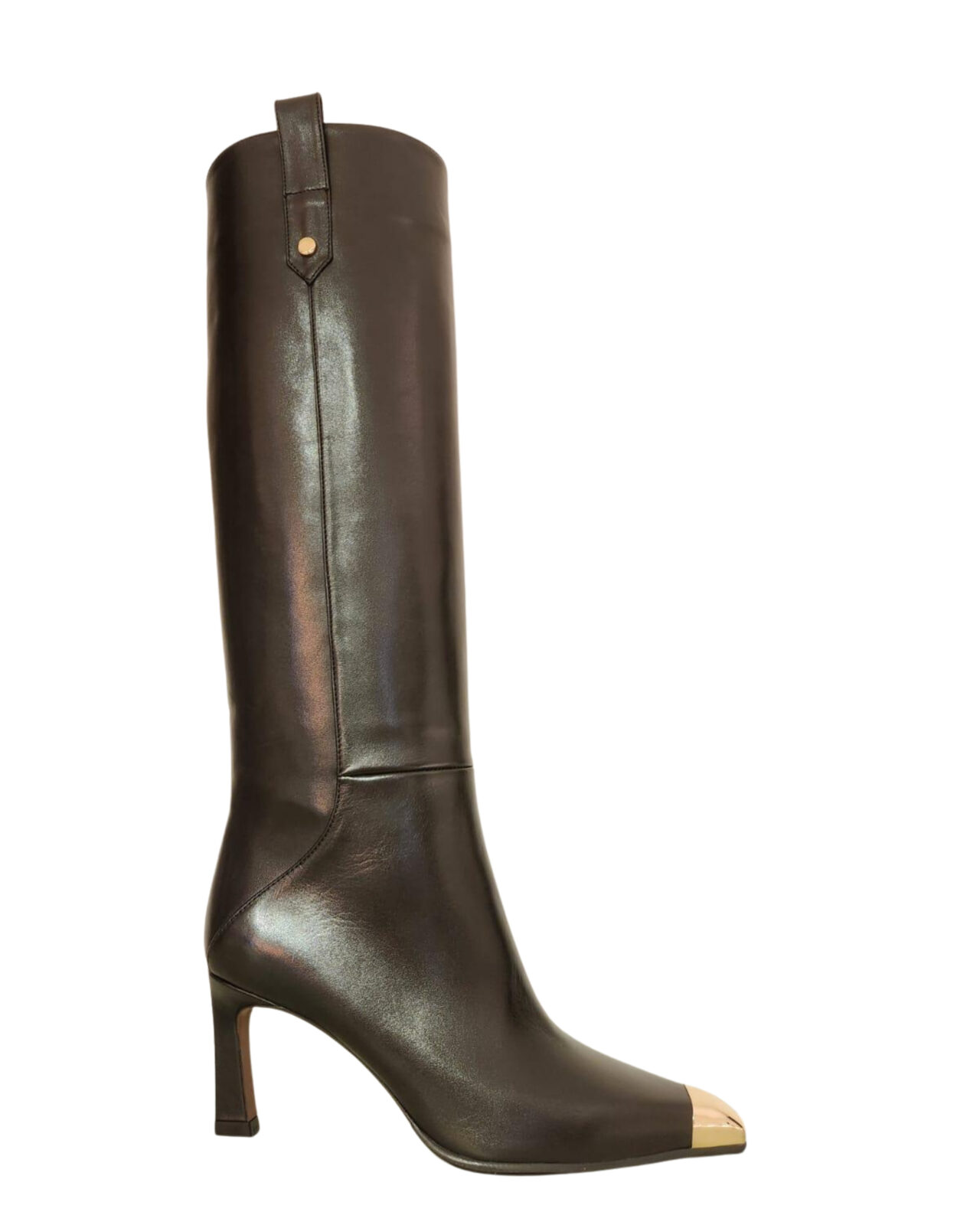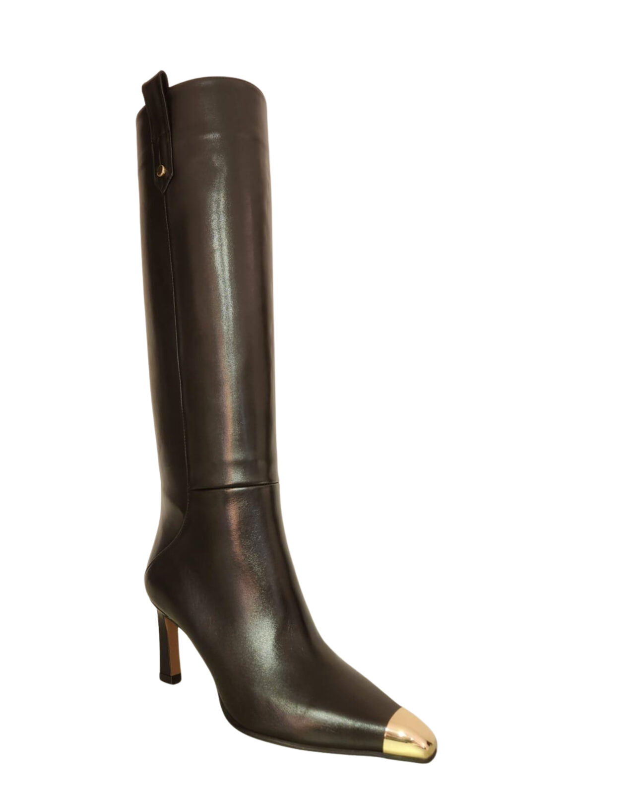 Pelle nera stivale punta oro. tacco 7 cm Black leather gold tip boots. 7 cm heel